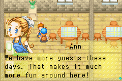 The graphics in FoMT were simple and had that nice rustic feel to it. The sprites were cute, and the character portraits were nicely illustrated, offering a variety of poses for different emotions. The music and scenery would change with the seasons, but unfortunately the town music never seemed to change, which was a bummer. The BGM was great and catchy overall, despite the GBA’s notoriously bad sound capabilities.
