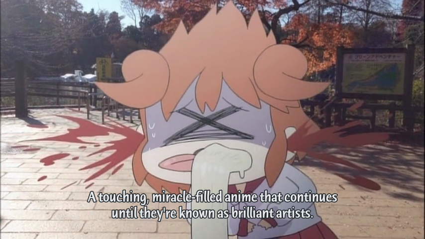 Of all the short anime shows this season, this might be one of the few with potential. It’s a slice-of-life story about two girls trying to fulfill a childhood promise to climb a mountain together and watch the sunset. It has surprisingly good animation considering that each episode is no longer than 5 minutes, with smooth character movements and good color palettes. It’s fairly ordinary and follows some typical slice-of-life cliches such as the hyperactive childhood friend and the socially-awkward protagonist, but it handles the material well without falling back too hard on those stereotypes.