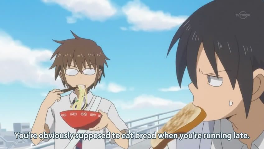 Of course, Akane manages to crash land on the beach, right in front of Wakaba Saegusa (Yuka Ootsubo), the top female Kendo fighter at the school and class president. A brief misunderstanding has Saegusa thinking that Akane is stronger than her, thus hurting her pride. It’s then by sheer coincidence that Akane transfers into the same class. This whole setup already sounds like the beginning of a romantic comedy (seriously, all that was missing is the bread).