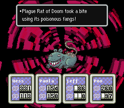 I should also explain the battle system too, huh? Well, if you’ve played any of the Dragon Quest series, than the battle screens should look familiar enough. It plays out in a first person view, with you putting in the commands for each character. The attack animations take the form of abstract flashes across the screens, with textual descriptions in the box. In battle, psychic abilities manifest themselves as PSI, or PK in the Japanese version, and act as magic. For example, PSI Fire will target a row of enemies, while PSI Lifeup will heal allies. PSI come in varying power levels, α, β, Γ, and Ω, that are gained upon leveling up. Alpha (α) is the lowest power level, while omega (Ω) is the highest.