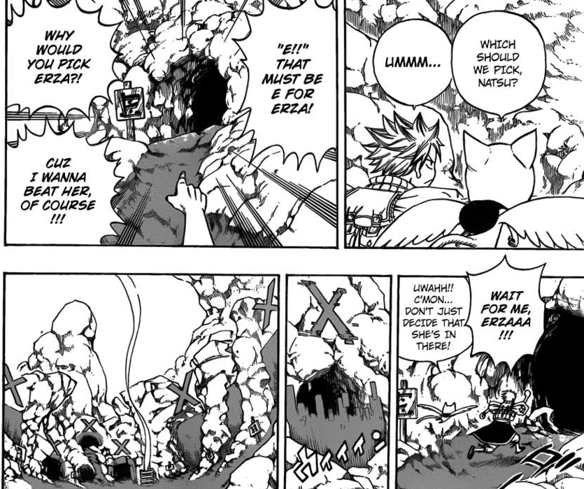that Natsu is constantly challenging everyone and everything to a fight. Are you a strong guy? Natsu will fight you. Are you a strong girl? Natsu will fight you. Are you an oddly capable animal? You better run because Natsu will not leave you alone until he beats you in a fight. Elfman had to fight Mirajane during the S-Class event and he should have got his ass kicked. Good job Hiro Mashima.