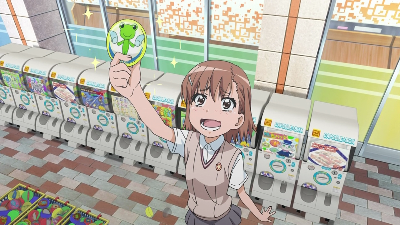 After an oddly competitive game of kick the can, Misaka goes on an otaku-level search around the city for an elusive Gekota (froggy) badge, in which she spends a ton of coins on. I’ve come to the conclusion that she must be rich (they might have explained this at some point and I’m just unobservant) because of this and her ability to rent hotel rooms like it’s nothing.