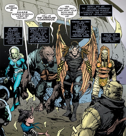 We actually got to meet a lot of important characters in the first volume of this series. The main team consists of both field and technical agents. Frankenstein is both the main character and the leader of the field team. As a zombie, Frankenstein has great strength and the ability to travel underwater without breathing. His main weapons include handguns and a sword that supposedly belonged to the Archangel Michael. Although he is very serious and a tough fighter, the years have made Frankenstein a very cultured man who treats women like a true gentleman. Lady Frankenstein is Frankenstein’s ex-wife and a top agent. She boasts zombie powers much like Frankenstein himself, but her four arms help aid her in using her handguns in an extremely effective fashion. Lady F is tough nosed, but she has adjusted to the times much better than her former husband. Father Time is the team leader back at S.H.A.D.E. His immortality is achievable through the ability to take over a new host body every ten years. The guy is more laid back than Frankenstein, but his ability to lead is quite powerful. Dr. Nina Mazursky is a master of eugenics and the team’s field scientist. She fused herself with special DNA in order to because an amphibious being. Nina is also the one responsible for transforming our next two team members. Warren Griffith is a new recruit that volunteered to become a werewolf for the sake of being on a team with Frankenstein. The guy has your standard new recruit mentality that makes him look like a kiss ass. Vincent Velcoro used to be a S.H.A.D.E. pilot, but he now takes to the skies as a vampire. It is pretty obvious that this guy is experienced because he complains about everything. Khalis is the wilcard. The guy is a complete unknown, but this mummy is the team medic. Watch out for some crazy powers out of this one. Like I said, we are dealing with a lot of monsters. Finally, we have Ray Palmer. The guy is a brilliant scientist and the liaison for the U.N. Although he is a scientists, the guy uses his tech to hold his own. Ray Palmer, Father Time, and Dr. Nina Mazursky all have basic combat skills, while the others are the heavy hitting field agents. We meet various characters along the way that all have a connection to S.H.A.D.E., but we have yet to be introduced to what looks like a main villain.