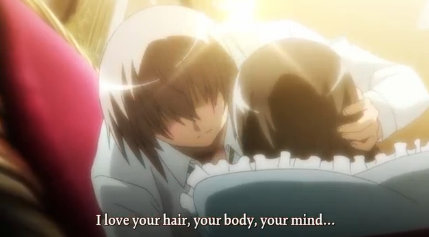 I am going to be honest with you. This was not nearly as bad as most of the other sexually charged scenes in the series. Why is that? Well, they avoided the crazy saliva that plagued the early scenes. Next, this scene just felt very natural. Passion felt for one another throughout a chaotic evening that culminated in this act. Even the end where Kiri stopped himself seemed right. Some people may call him a bitch, but I see it as a guy that lost himself during a very emotional time finding his composure and stopping himself. Who wants their first kiss, and possibly more, to happen in some strange hotel with a bunch of freaks, the police, and a dead body in the area? Everything just seemed naturally awkward at the end. I do have a problem with the fact that this is happening between middle schoolers, but you can’t really help that in anime. I am just looking forward to what is hopefully going to be more action. Although, the preview kind of scares me.