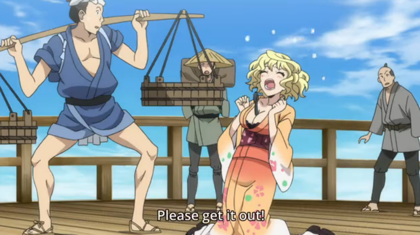 I like women as much as the next guy, but they need to stop the breast focus in this series. It is bad enough that the opening has a bounce and all of the previews talk about Oharu’s chest, but this was too much. Half of the episode was spent having Mitsuki seduce Jinbei. That is an interrogation tactic, but I could have done without the eel scene. Overall, I think that it wasn’t a horrible series of events, but it went a little too far at times. I am excited to see more of Mitsuki, but in a more fully clothed state I hope. Aside from that, I am really looking forward to the fight against the Insect Hunters.