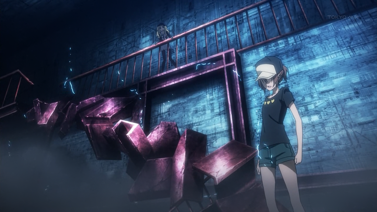 Frenda Seivelun (CV: Maaya Uchida, as in Rikka Takanashi from Chuunibyou) faces off against Misaka this episode. She wields an assorted battalion of weaponry and focuses on using her surroundings against her opponent. Too bad Misaka can manipulate metal at her will by generating magnetic fields. It’s still quite fascinating (and quite awesome) how Frenda can pull out a seemingly infinite barrage of explosives from under her skirt. She’s like a modern day female Gilgamesh…or Link. I mean she throws Bullet Bills, how cool is that?!
