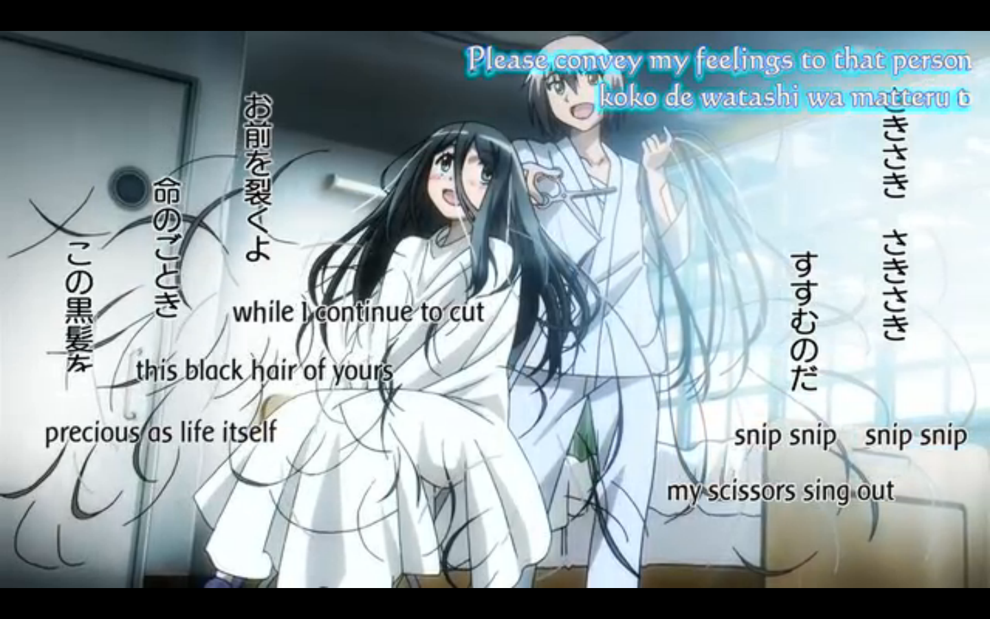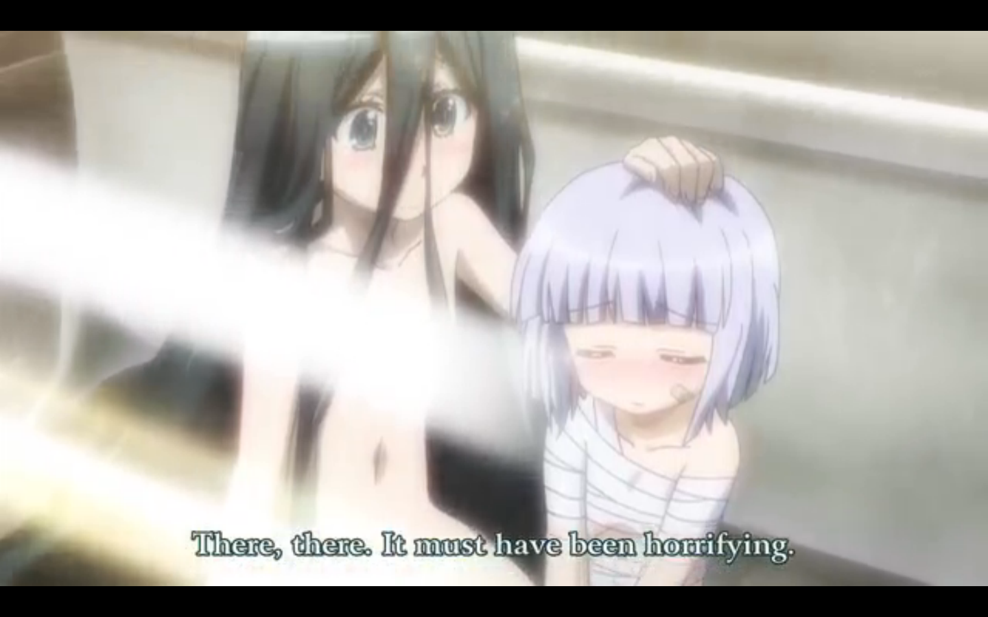We start at the exact same spot where we left off in the previous episode. Emily was freaking out about being attacked by Kiri and Iwai is trying to console her. The fire is bound to spread and the two girls make their escape. Kiri catches up to them and he begins to subtly assault Iwai by fondling her and forcibly cutting her hair. After this bit of trauma, Iwai’s hair starts growing again and Kiri collapses. The three kids get picked up by emergency services and Kiri ends up in a Gossip hospital. The two girls end up bonding over their shared father. Diaries are read, stories are shared, and a bath is taken. Unfortunately, way too much time is spent on a loli bath scene. Emily agrees to stop trying to kill Iwai and a very happy time is had. Although the girls had fun, Kiri may not be feeling the kind of love that he was expecting.