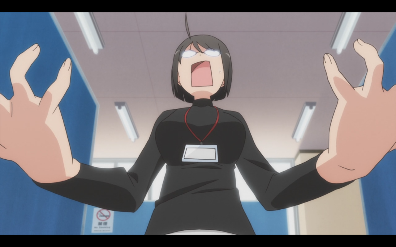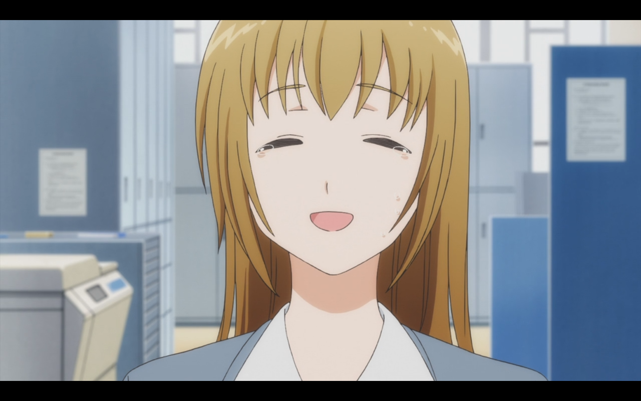 The comedy of this series lies in the interactions of the new employees as they try to get accustomed to their new jobs. As civil servants in the health and welfare section, the three have to get used to answering questions and talking with other people. Yagami is paired up with another employee by the name of Megumi Chihaya (voiced by Aki Toyosaki) on her first day. Although Megumi is a supporting character, she was pretty funny due to her emotionless and kind of nonchalant attitude. As the episode goes on, we get to see some funny reactions from the characters as they adapt to their situations and eventually meet with one another. One of the funnier scenes for me was when the supervisor, Taishi, meets up with the new employees and questions why Yagami didn’t put out her full name on a form. Yagami confesses that she couldn’t do that since her name is actually ridiculously long thanks to her indecisive parents. Her full name is actually Lucy Kimiko Akie Airi Shiori Rinne Yoshiho Ayano Tomika Chitose Sanae … Yamagami, but everyone just calls her Lucy for convenience (and I will too). Anyways, Lucy then explains that her main motive for working in civil service is to track down the careless man who approved her ridiculous name and seek revenge. Afterwards, we have several funny interactions between Hasebe and Lucy before the episode ends.