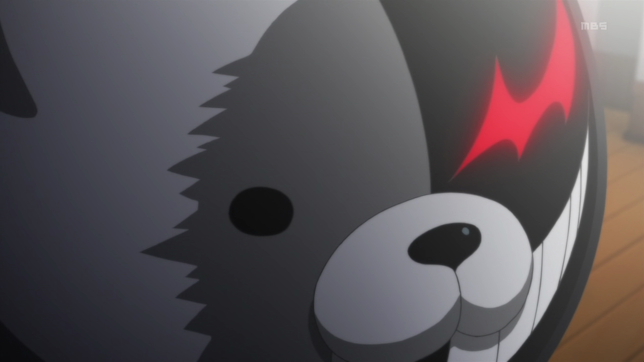 You guys ready for some more Dangan Ronpa? Good, because this episode is where things get real. As a fair warning, this impression will contain SPOILER details and content, so turn back if you have yet to watch the episode. We start with a short recap from Naegi’s perspective, before checking out the new opening song, “Never Say Never,” a remix of the theme song by TKDzZb. I seriously enjoyed this awesome remix and am looking forward to the full version of it. Anywho, we return to Naegi as he observes every nook and cranny of his room at night in an irritated manner. Upon trying to open his bathroom door, Naegi finds that the door refuses to open. Monokuma waltzes in to surprise him and inform him that he has the misfortune to be the only one with a misaligned door.