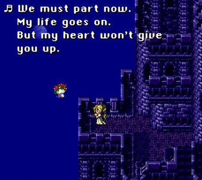 Of course, we have Nobuo Uematsu’s genius music once again, in what many (myself included) consider to be his greatest work on a game ever. Each of the 14 characters has his or her own special theme, generating a stronger and more meaningful bond with each of them. Throughout the game, familiar tunes are rearranged and add that character’s personality to the scene, very much as leitmotifs (a technique made famous by Wagner) do for opera. Speaking of opera, we have the (arguably) most famous scene in Final Fantasy history.