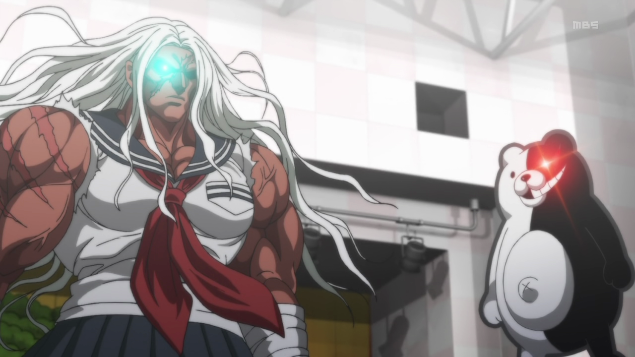 Despite their progress, MonoKuma points out that there is a true culprit amongst the remaining members and presses everyone to make a conclusion. The gang then falls silent thanks to the dead end they’ve reached, but Naegi’s impeccable memory allows him to realize that Celes was the true culprit due to her strange statement upon first finding Yamada “dead.” Celes then reveals her crazy side before engaging Naegi in a heated MTB. Naegi wins the heated debate by requesting that Celes shows everyone her Student ID which displayes her true name. Celes easily admits defeat before accepting her final fate and bidding everyone farewell. After MonoKuma delivers the tragic and brutal execution, Kirigiri reveals a secret location to Naegi and asks him to investigate it. Naegi goes to a hidden room in the boy’s restroom of the second floor and discovers several documents. Soon after his discovery, a masked stranger appeared and knocked him out. Naegi awakens in a very confused state and stumbles into the gym to find a strange battle between Sakura and MonoKuma before the episode ends.