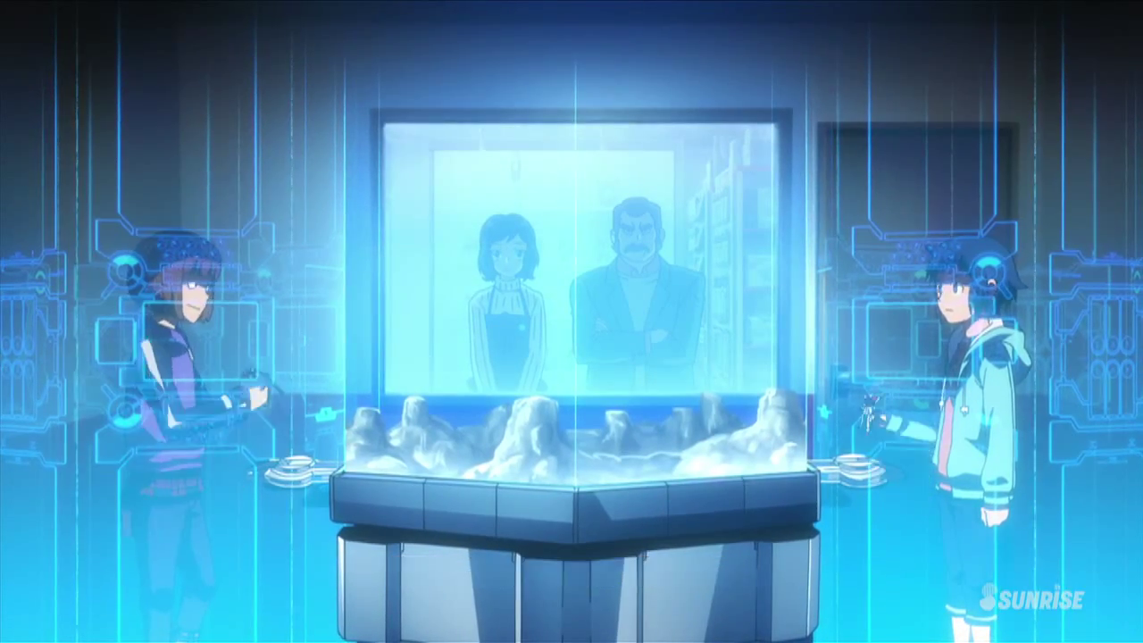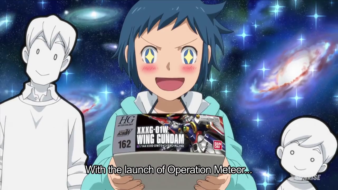 We start with some blue-haired kid who wakes up from a dream about Gundams, only to suddenly freak out about the one that he was building beforehand. He then goes on to watch over his family’s Gunpla store and tries to help a young boy pick a model, but ends up rambling about one of his favorite models. I found this scene to be a little comedic since I may have done something like this before in my life. Some snotty rival then enters the store and suddenly challenges the protagonist to a Gunpla battle. Here is where we get a better idea of what happens in the anime. Basically, this world has somehow created technology to bring plastic models to life and decides to use it to make a Gunpla fighting tournament. Back to the fighting, the protagonist chooses to use his Wing Zero model and wants to prove that you can’t win in the game without putting your heart into building the model. Surprisingly, the protagonist sucks with the controls and gets his ass whooped by the snotty rival. The protagonist then runs off to loathe on his own, but ends up meeting a mysterious red-headed boy. He saves the stranger from some trouble with a baker and befriends him. The strange boy then gives him a marble and promises to grant one of his wishes. The next day, the protagonist tries to show off his custom model of the Strike Gundam to his mom, before the snotty rival appears and tries to snatch it through another battle. The protagonist is happy to oblige, but realizes that he still sucks in the game. He soon makes a wish to be able to fight back and the red-head suddenly appears to pilot for him. The strange friend starts to kick ass like a “Newtype” and wins him the battle before the episode ends.