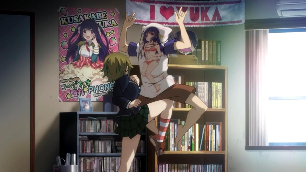 The story set up for what I feel will be a frustrating experience for me. Kousaka Hata is obsessed with a pop star, Kusakabe Yuka . Disgusting amounts of posters on his walls, figurines, a body pillow with Yuka in a bikini printed on it, frequent mailing of fan letters and packages to her, the full extension of grossness. Hata is creepy to the point of being borderline antisocial. When Yuka announces her retirement, his devastation keeps him bedridden, even when his loving, caring friends take the time to visit him and ensure he gets to class and keeps his grades up. Hata goes as far to be rude to his friends, and it was this that made me decide once and for all that I am not going to root for the protagonist of this series. Screw Hata, he’s not good people.