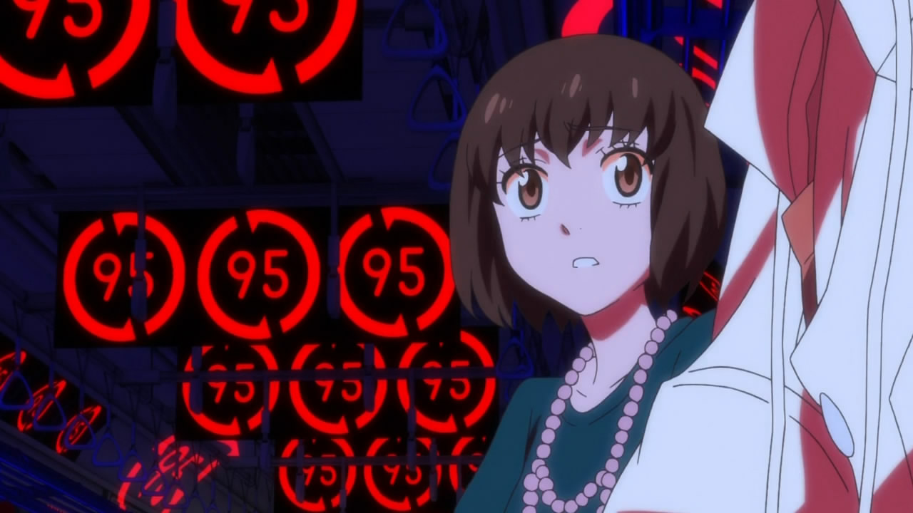 Trains play an important role in Mawaru Penguindrum, not only as an allusion to the Sarin attacks but also for their ability to merge the concept of social boxes with the motion of fate. They’re devices that are designed to house us in boxes and transport us to our desired destination along designated tracks. This is made evident in the series by the train motif that is used when scenes transition to different locations or when flashbacks occur. These transitions are always accompanied with a Tokyo subway style destination sign indicating where or when the next scene is going to take place. Some scenes occur in an abstract location known as “The Destination of Fate” (運命の至る場所, unmei no itaru basho). This location takes the form of a subway cabin, often with strange color palettes and the number 95 can be seen projected throughout the train, a reference to the Sarin attacks. Each 95 is inscribed by a circle of arrows to represent the constant motion that is brought about by fate and perhaps even disaster itself.