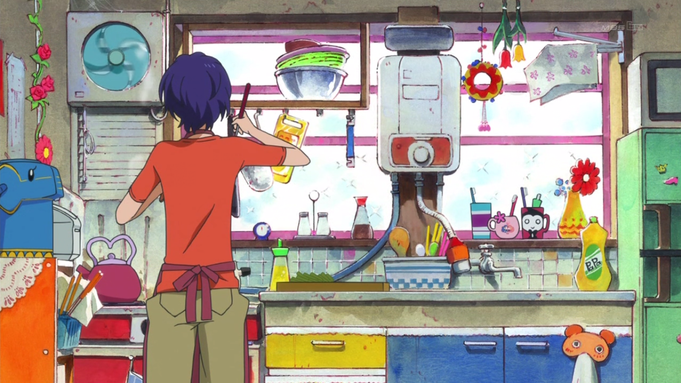 From this point on, they live together under the same roof and put on a charade of a family unit that even fools the viewers for the first half of the series. The Takakura household is the most vibrant setting in the entire series, contrasting heavily with the many other abstract and sometimes monochromatic locales. Much detail is given to scenes that take place in the house, as if to highlight the importance of the concept of home. Primary colors dominate much of the palette, lending childlike innocence that masks the façade of three children who are simply playing house.