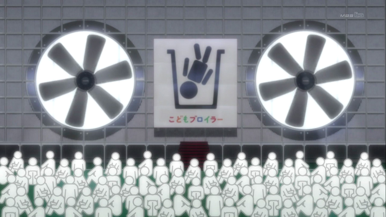 Inherited issues and the construct of the home are important points of discussion regarding modern Japan, and these points are represented in very abstract ways in Mawaru Penguindrum. Late in the series, we learn that the three Takakura siblings are actually not blood related and were brought together by fate at different points in their lives. The encounter between Shouma and Kanba is depicted with a scene of the two trapped in adjacent cages located in a black void. The two are on the verge of starving to death when fate intervenes by providing Kanba the means to survive, in the form of an apple. Despite being chosen by fate, Kanba willing shares part of the fruit with Shouma, allowing both of them to survive. Shortly after this meeting, Shouma finds Himari abandoned in a bleak warehouse called “The Child Broiler” (こどもブロイラー, kodomo buroira) where unwanted children are disposed of, and saves her by sharing a part of his apple.