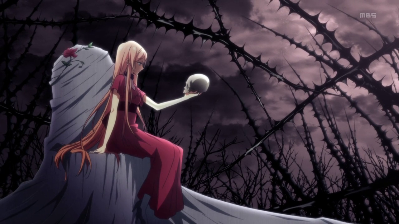 This is a huge episode and probably the best thus far. So much happens in terms of plot and action, surpassing all expectations for an episode featuring the final boss of sorts of Akuma no Riddle: Sumireko Hanabusa. From the beginning, I had a feeling that she would be saved for last (excluding Nio because she’s just the arbitrator). The question was what type of ability she would have. Despite (or perhaps because of) her fragile appearance, it was easy to suspect that there would be something ridiculous happen.