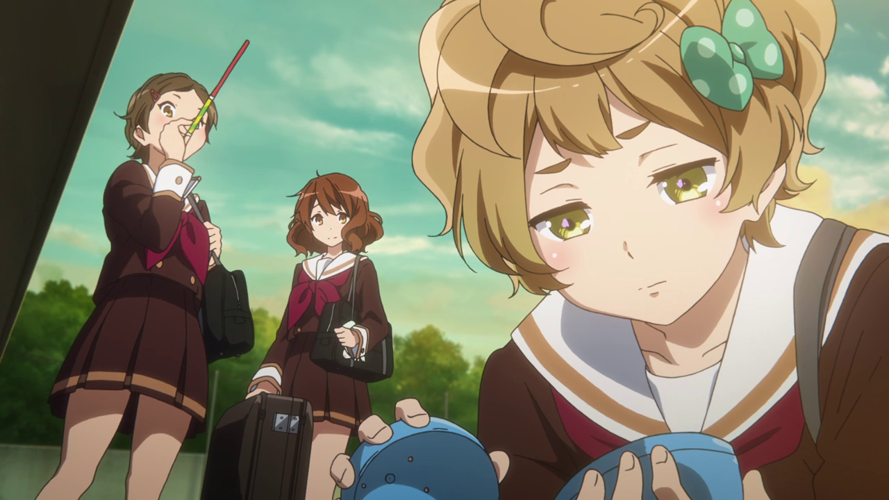 We finally get into the meat of the story this week as our protagonists get their hands on their respective instrument. This is always an incredibly exciting moment for any student musician because it’s that magical moment when you meet your partner for the next some-odd years, possibly realizing you’re incredibly out of practice or don’t know how to play it at all. It’s the ultimate beginning for any musician, and this episode probably wouldn’t feel to out of place as the first episode in the series. However, I still feel that the first two episodes provide necessary exposition and give us a good sense of the characters’ personalities as well as the setting of Kitauji High School.